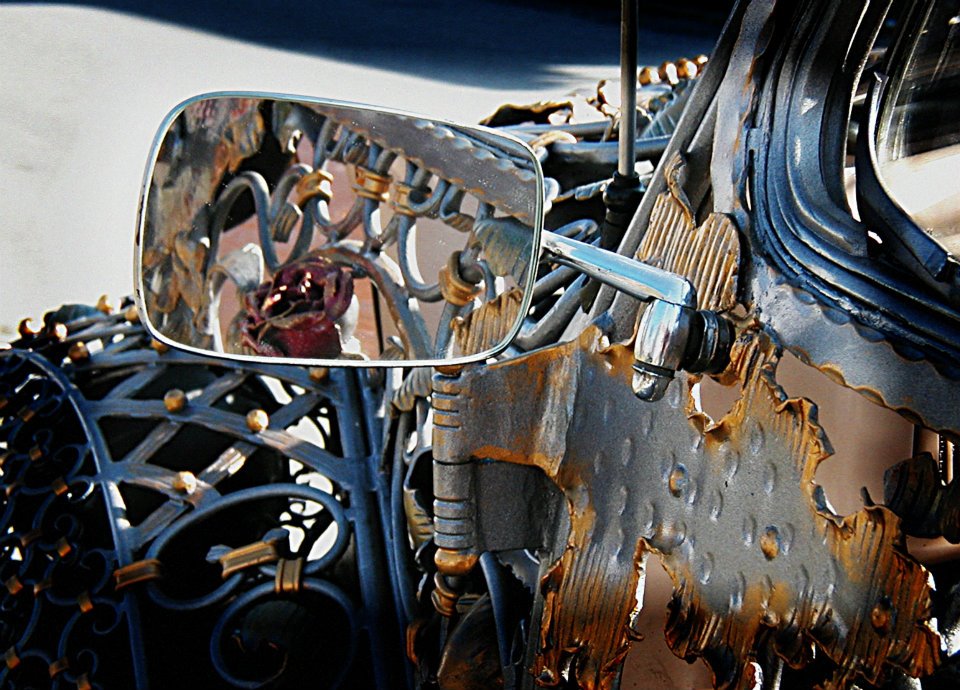 Handmade wrought iron, heated, bent, hammered, and welded onto the original chasis